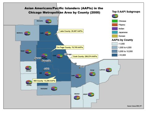 According to the latest Census, the Asian Pacific American population in Illinois numbers approximately 428,213, or 3.4% of the statewide population. Approximately 71,469 Asian Pacific Americans reside in DuPage County, comprising 7.9% of DuPage County's population, with the bulk of the other 262,731 residents of Cook County, comprising 4.8% of Cook County's population. The 2000 Census shows that Asian Pacific Americans reside in Chicago in communities including West Rogers Park, Albany Park, Uptown, Armour Square and Bridgeport, and in suburban Cook County in communities including Schaumburg, Hoffman Estates and Skokie.
